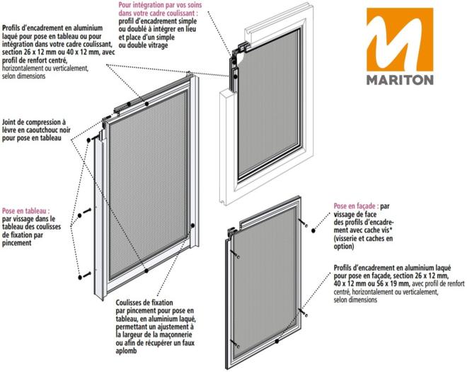 La moustiquaire Moustifx avec ses différents profils permet une installation en pose tableau avec des coulisses de fixation qui permettent un ajustement de la largeur et de récupérer un faux aplomb.