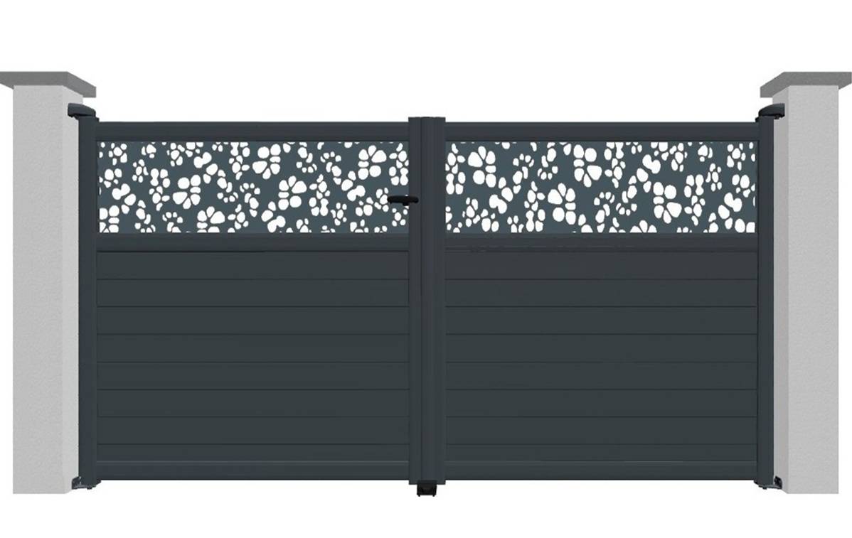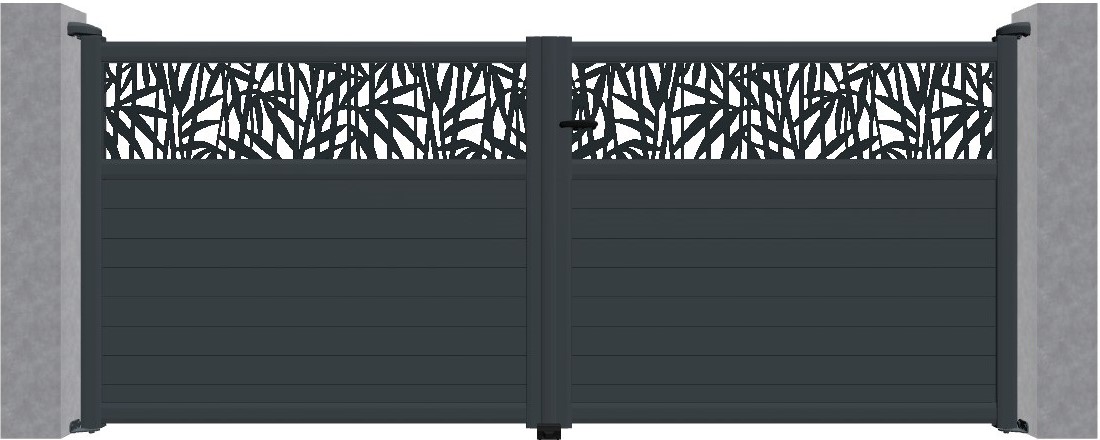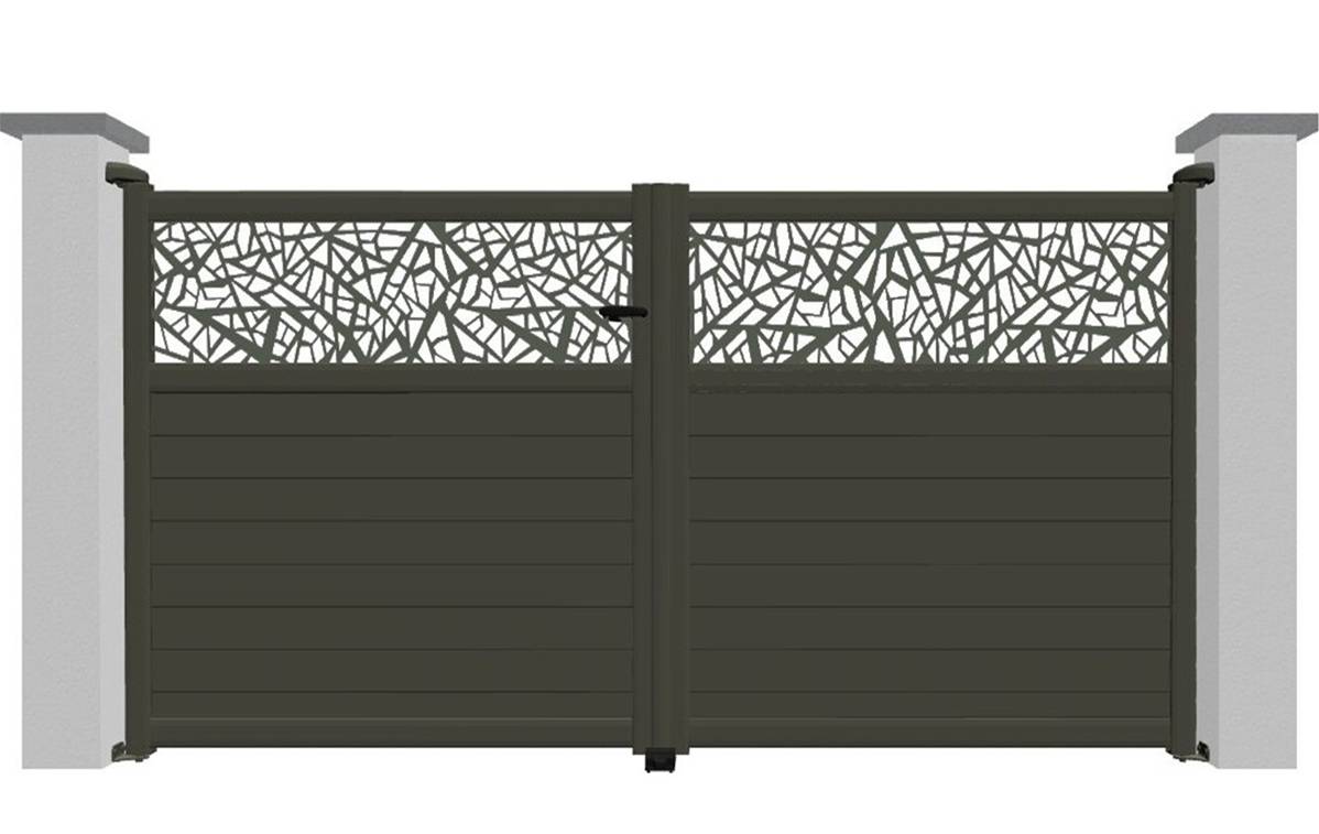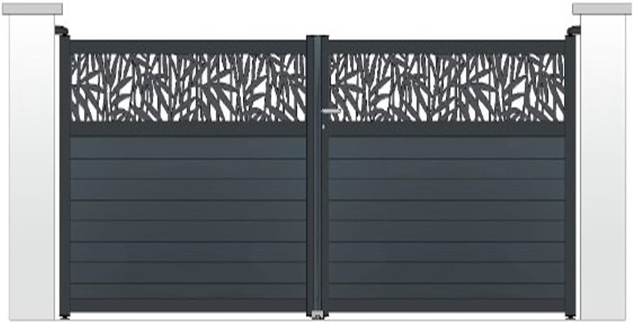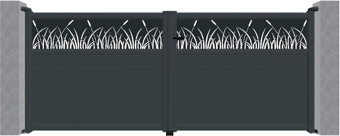 Le portail ONYX Déco est réalisé avec des profils en aluminium et un remplissage en parties hautes avec une tôle aluminium 2 mm assortie de décors pour 8 modèles de décors au choix : Tempo, Roseaux, Bambous, Primtemps, Éclats, Automne, Galets, Squares.