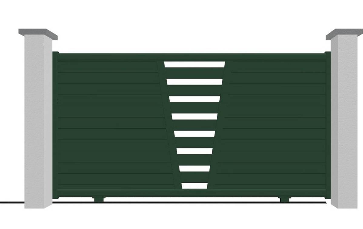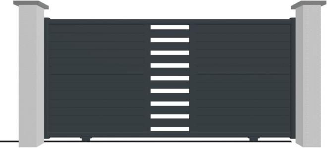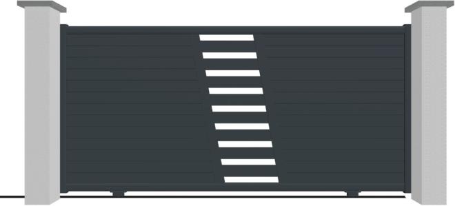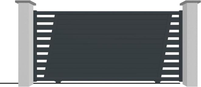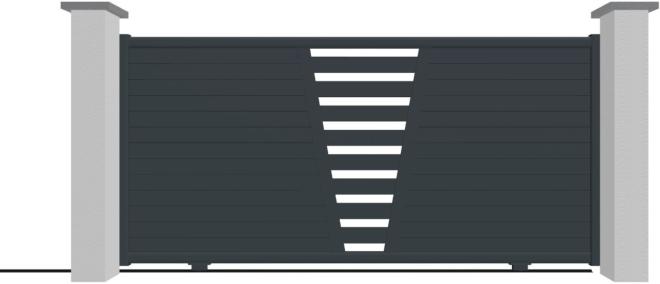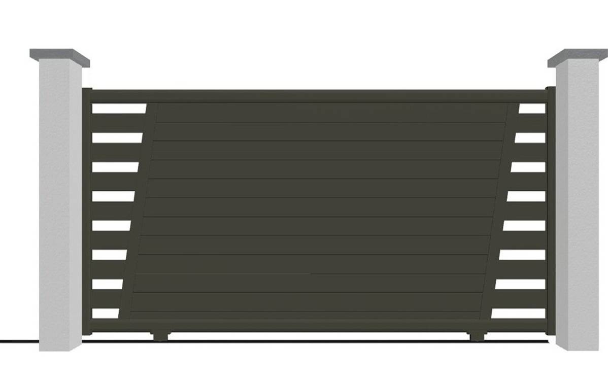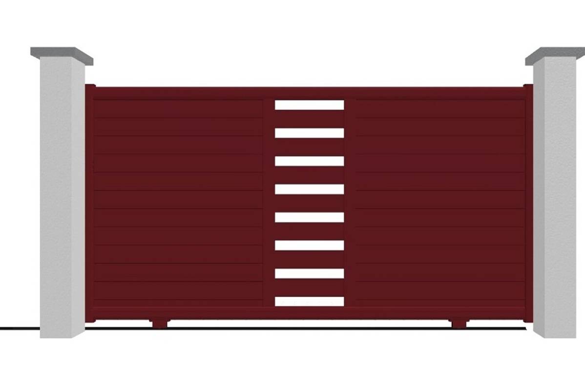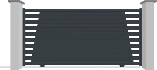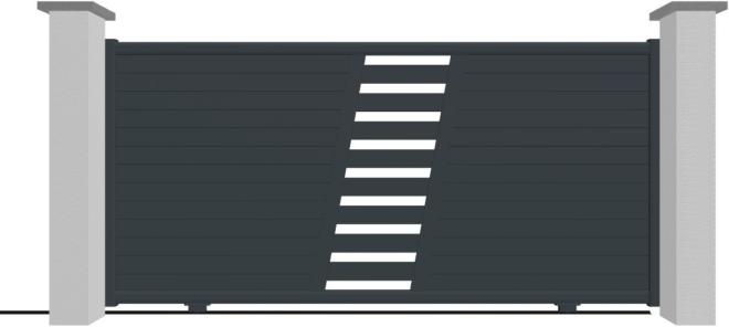 Le portail coulissant TOPAZE est réalisé avec des profils en aluminium de sections 70 x 40 mm pour les traverses basse, intermédiaire et haute, et des montants en aluminium de 70 x 50 mm. Le barreaudage est réalisé avec des lames de 100 x 20 mm disposés horizontalement et espacées.